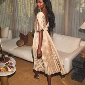 Be the first to review “Golden Gatherings Pleated Satin Maxi Dress”